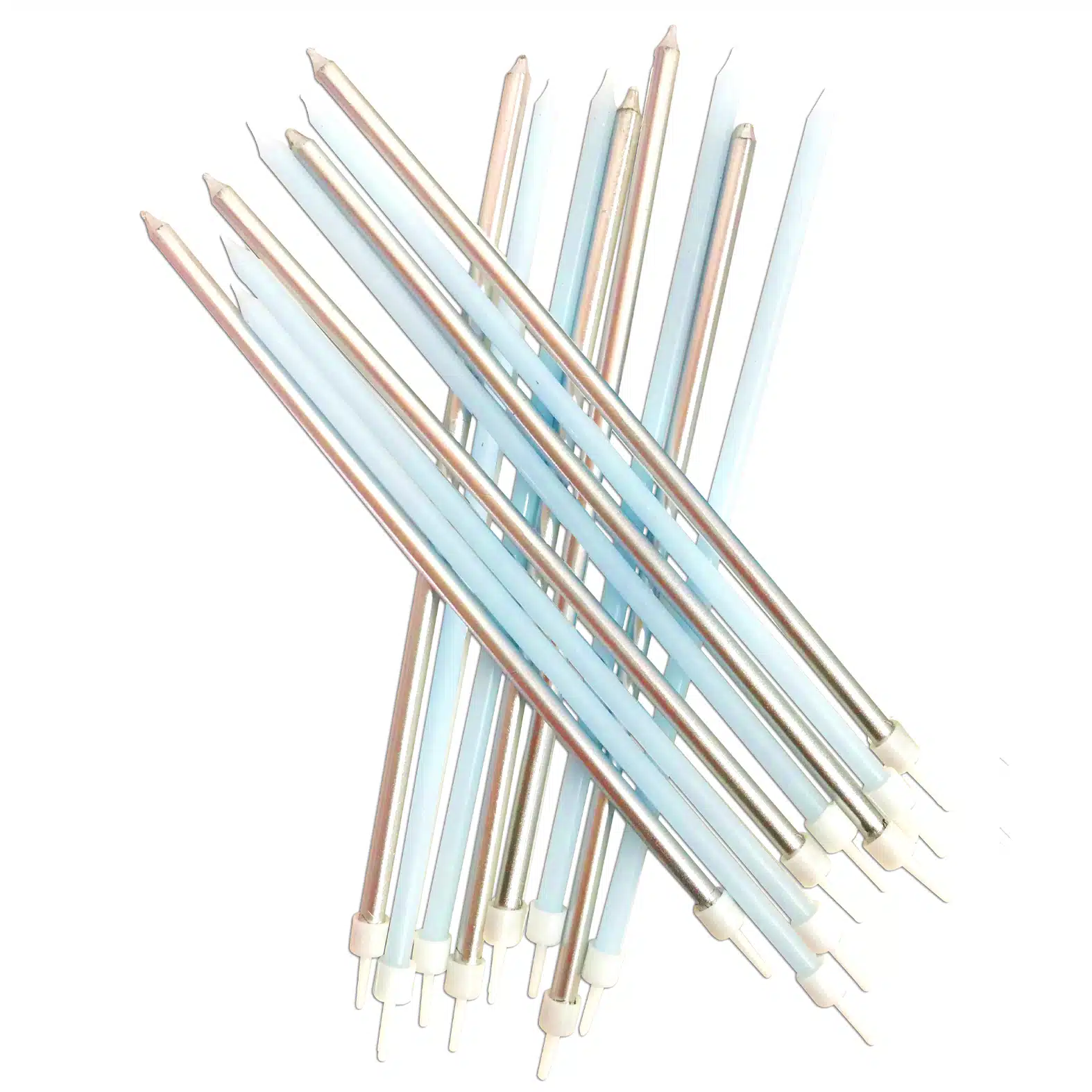Extra lange kaarsjes van Anniversary House van 18cm lang. De verpakking bevat 8 metallic blauwe en 8 zilveren kaarsjes. Perfect als combinatie op een verjaardagstaart. De kaarsjes hebben een houder.