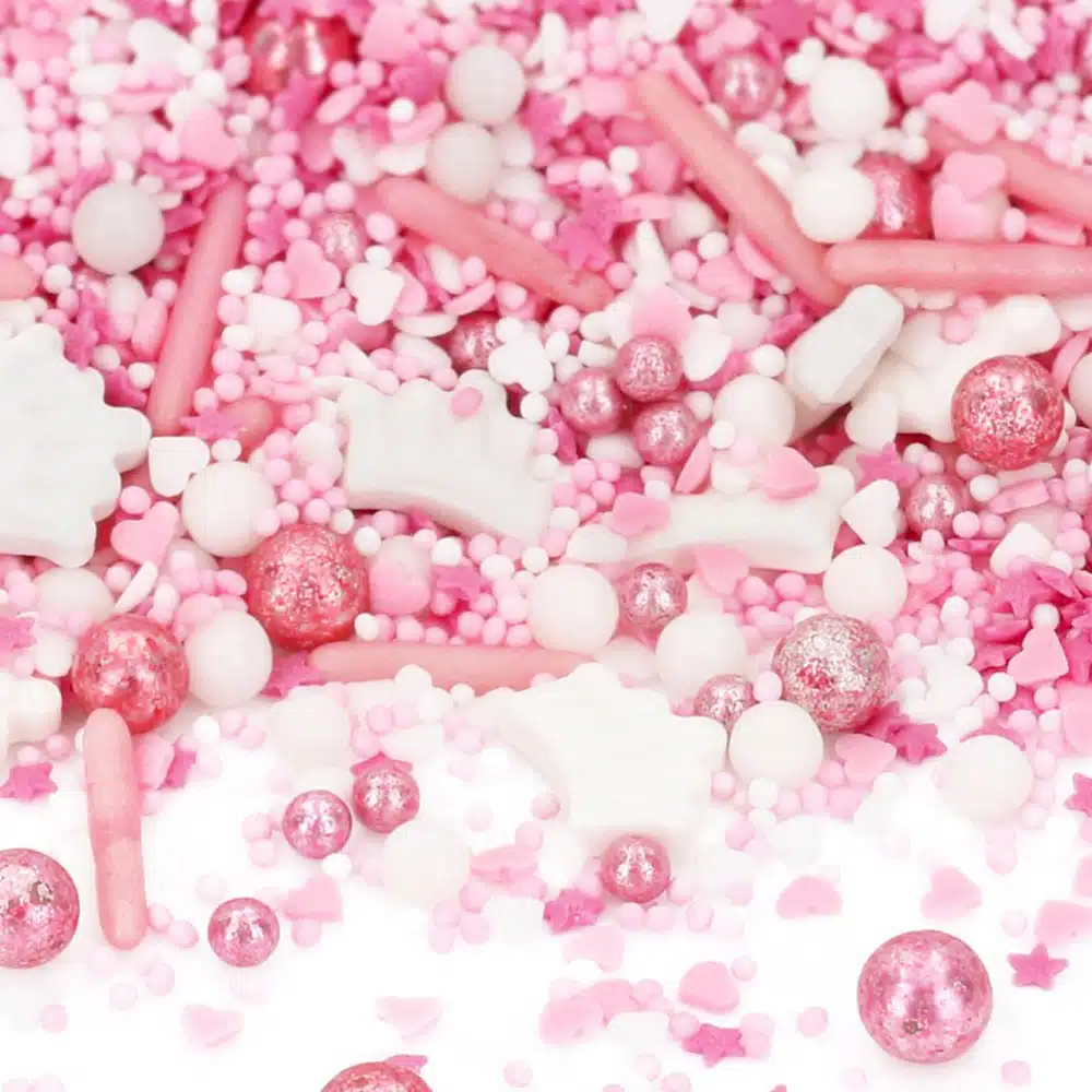 Laat de droom van een klein prinsesje uitkomen met deze sprinkles van Cake-Masters met de veelzeggende naam Princess Dream! Een mooie combinatie van verschillende tinten roze met witte kroontjes. Perfect voor een prinsessenfeestje!