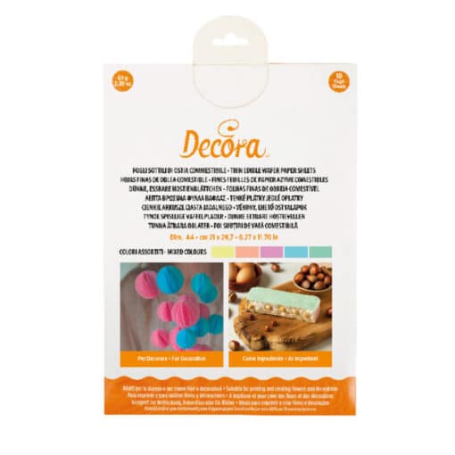 Maak de mooiste decoraties met deze gekleurde wafersheets (ouwel) van Decora. Gebruik ze voor het maken van bloemen of andere decoraties, of bijvoorbeeld om op te printen, tekenen of schrijven.