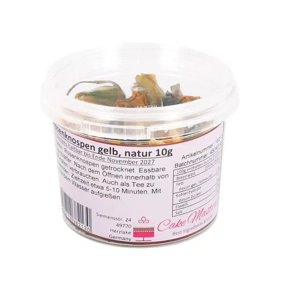 Deze eetbare bloemen zijn echte, gedroogde rozenknopjes die je kunt gebruiken als decoratie op b.v. taarten, eclairs en andere zoete traktaties. Maar de rozenknopjes kun je ook heel goed toevoegen aan salades.. De knopjes zijn eetbaar en kunnen ook voor de thee worden gebruikt. Als je ze voor thee gebruikt moet je ze ongeveer 5-10 minuten laten trekken.