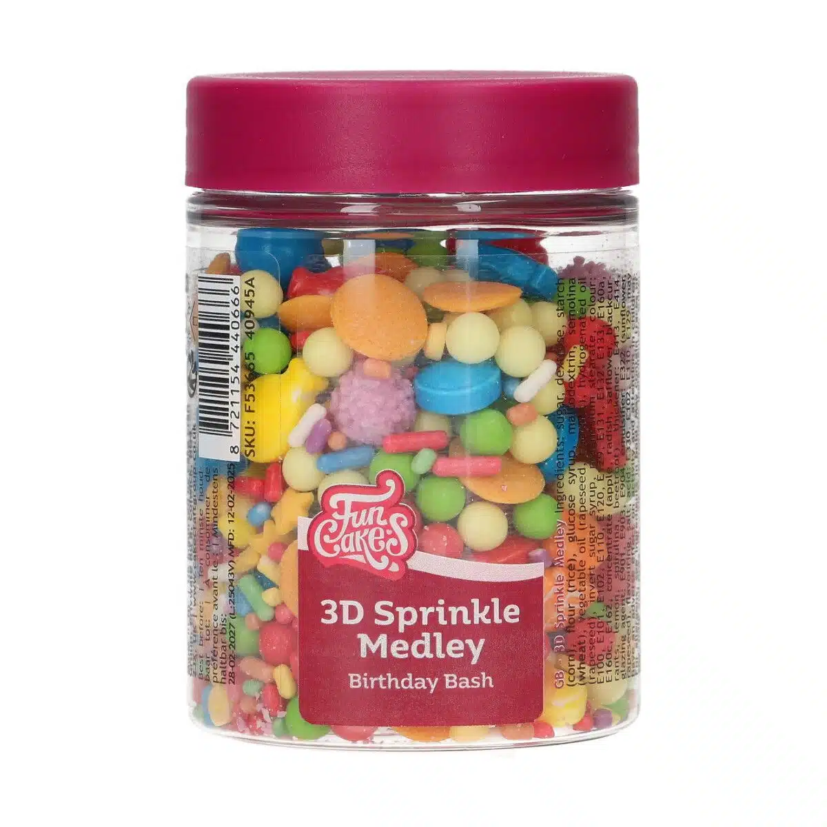 Een verjaardagsfeestje is pas compleet als er gesprinkled is! Met deze FunCakes 3D Sprinkle Medley Birthday Bash weet je zeker dat de sfeer er goed in zit! Vrolijke sprinkles in lekker felle kleuren met feestelijke vormpjes.. ideaal voor over een eenvoudige toef op een cupcake, of lekker op een brownie. De felle kleurtjes steken vrolijk af tegen elke ondergrond!