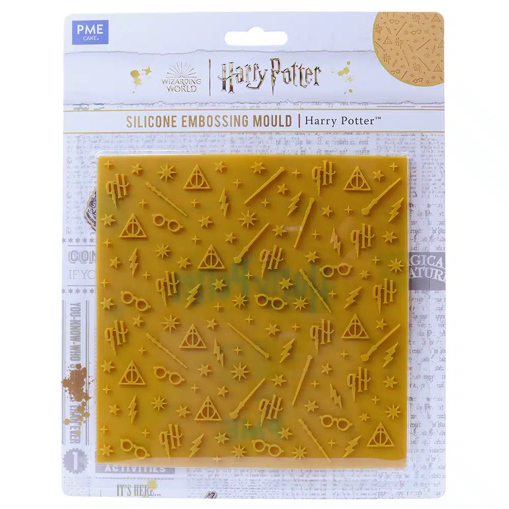 Met deze gave impressie mat in het thema Harry Potter maak je simpel en snel de mooiste traktaties. De mat heeft een patroon van allerlei Harry Potter symbolen. Je drukt de mat eenvoudig in fondant of marsepein en gebruikt daarna deze fondant op bijvoorbeeld cupcakes en koekjes.