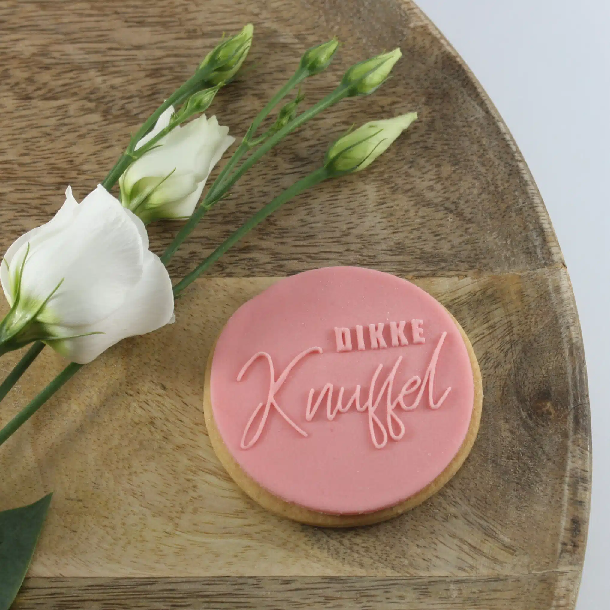 De stempel heeft de tekst dikke Knuffel en is gemaakt van antraciet grijze food-grade acrylaat. Formaat: 80×80 mm zodat je hem kunt gebruiken met verschillende cutters. Dikte van de stempel: 5 mm.