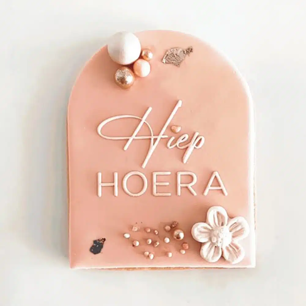 De stempel heeft de tekst Hiep Hoera en is gemaakt van antraciet grijze food-grade acrylaat. Formaat: 80×80 mm zodat je hem kunt gebruiken met verschillende cutters. Dikte van de stempel: 5 mm.