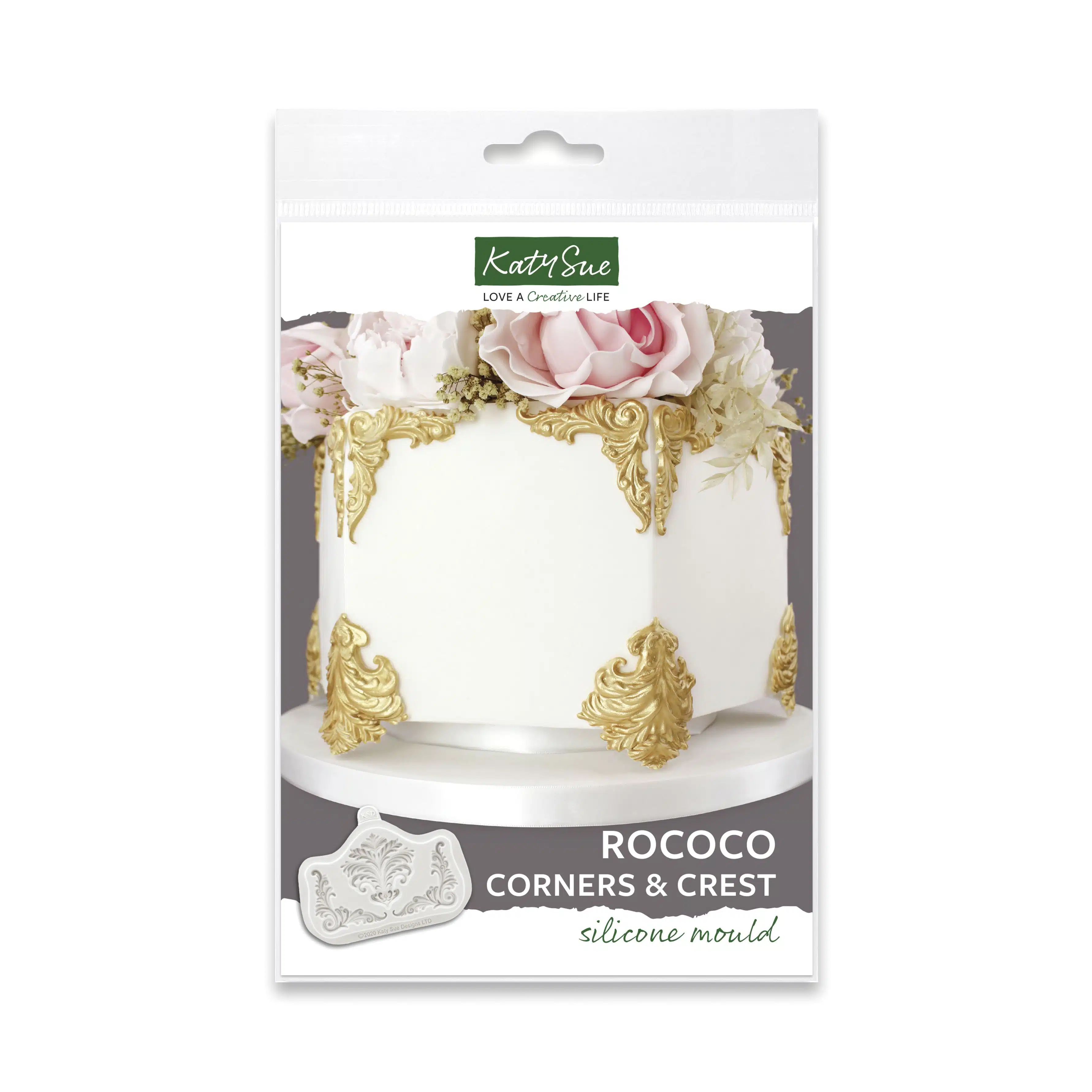 Maak prachtige versieringen in Rococo stijl met de Katy Sue Silicone Mould – Corners & Crest. Deze mal bevat twee decoratieve hoeken en een opvallend crest-design, ideaal voor de mooiste decoraties van fondant of modelling paste. Je kunt de hoeken apart gebruiken of in combinatie met het extra design. Eventueel kun je de gemaakte decoraties voorzien van een mooie gouden glans door het gebruik van eetbare verf of poeder.