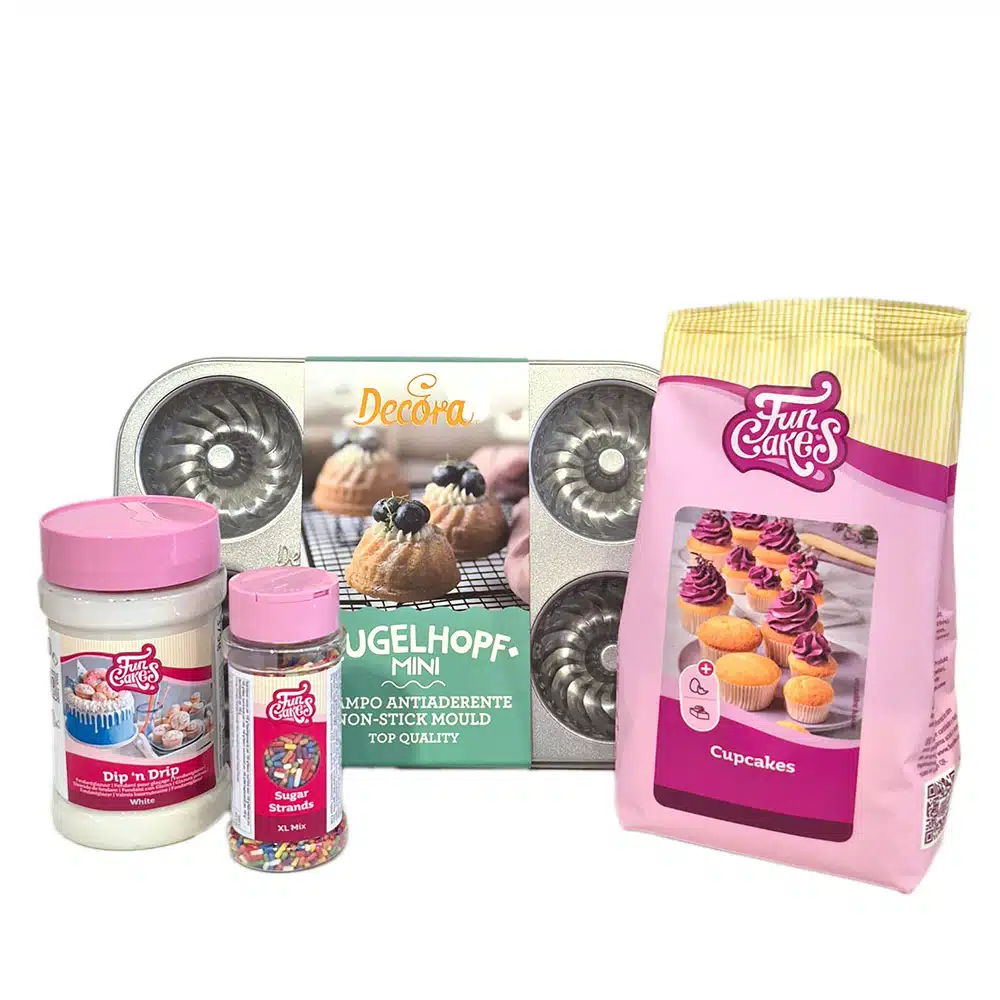 Geef je dit pakket niet cadeau maar ga je zelf aan de bak? Volg dan de volgende stappen: Vet de vorm in met bakspray of boter en bloem. Maak de mix klaar volgens de verpakking. Vul de minitulbandjes tot 2/3. Heb je beslag over? Draai gerust nog een ronde of vul een andere kleine bakvorm. Bak de tulbandjes 20 minuten in de oven. Check of ze gaar zijn door een satéprikker in één van de cakejes te steken. Als deze er droog uitkomt, zijn de cakejes gaar. Laat één minuutje staan en stort ze dan op een rooster. Laat goed afkoelen.