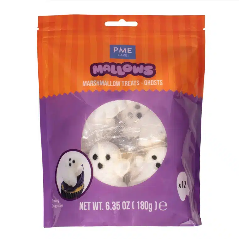 Hoe gaaf zijn deze marshmallow spookjes van PME! Zacht, spookachtig en griezelig leuk! Deze Halloween marshmallows zorgen voor een zoete twist bij jouw scary traktaties! De verpakking bevat 12 individueel verpakte zachte marsmallows in de vorm van een spook van 5cm hoog. Leuk voor bij de warmechocolademelk, in een trick-or-treat zakje of gewoon geweldig op een cupcake!.