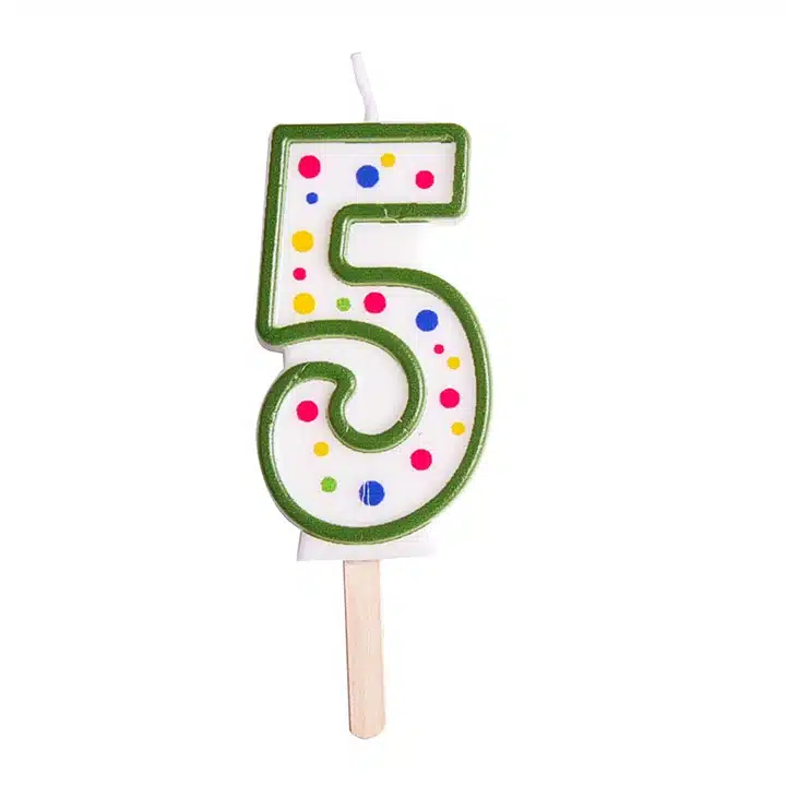 Cijferkaars nummer 5, wit met groen en gekleurde stippen