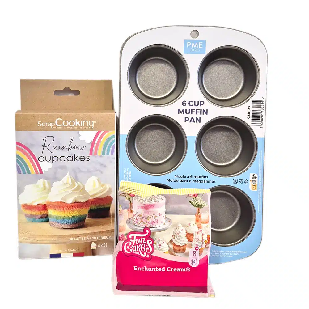 De set van ScrapCooking bevat 4 potjes gekleurd bakpoeder, een maatschepje, baking cupjes en een recept. Het recept gaat uit van eigen ingrediënten, dus je moet nog boter, eieren, bloem en suiker toevoegen. Voor de topping hebben we je het gemakkelijk gemaakt: de spierwitte Enchanted Cream is perfect voor een mooie toef op je cupcake! Onze tip: maak het met melk of slagroom en skip het water, dan heb je heerlijke romige crème!