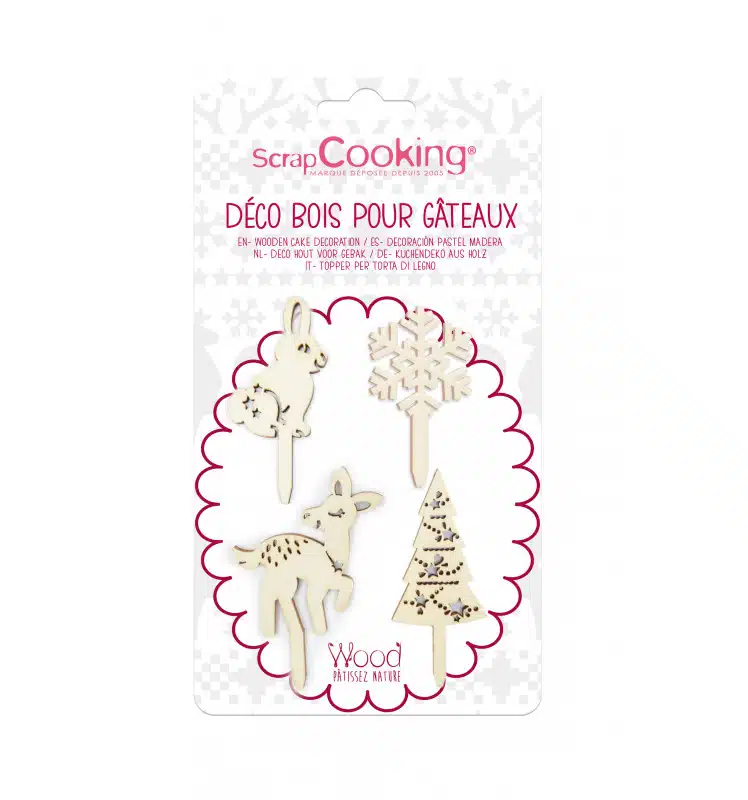De set bevat een topper van een konijntje, een hertje, een sneeuwvlok en een kerstboompje die gemaakt zijn van voedselveilig hout. Steek ze eenvoudig in je creatie en zorg zo voor enthousiaste reacties!