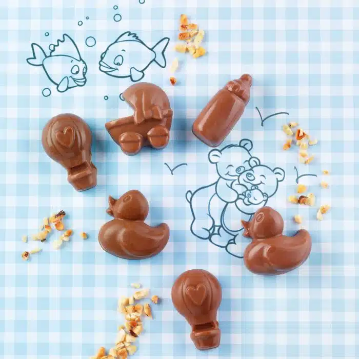 Ontzettend leuk voor een babyshower: chocolaatjes in baby thema! Maar denk bijvoorbeeld ook aan een gender reveal party met roze of blauwe vulling in de chocolaatjes! Deze mould van Silikomart bevat 12 vormpjes in 4 dessins: flesje, kinderwagen, baby eendjes en kleine luchtballon.