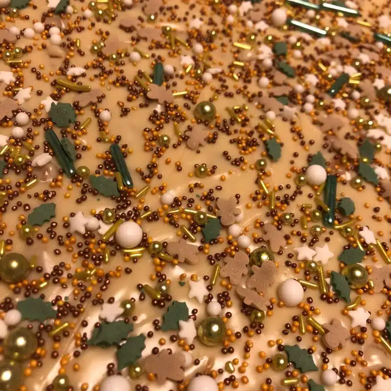 Strooi er een leuke kerstsprinkle overheen en zet hem vervolgens minimaal 2 uur in de koelkast om op te stijven.