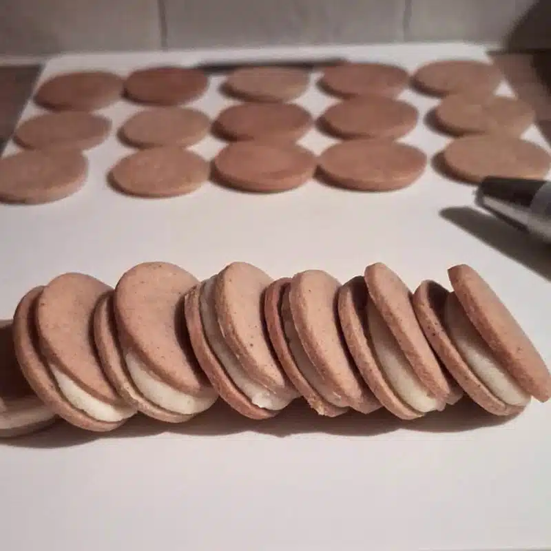 - Leg een tweede koekje op de vulling en duw zachtjes.