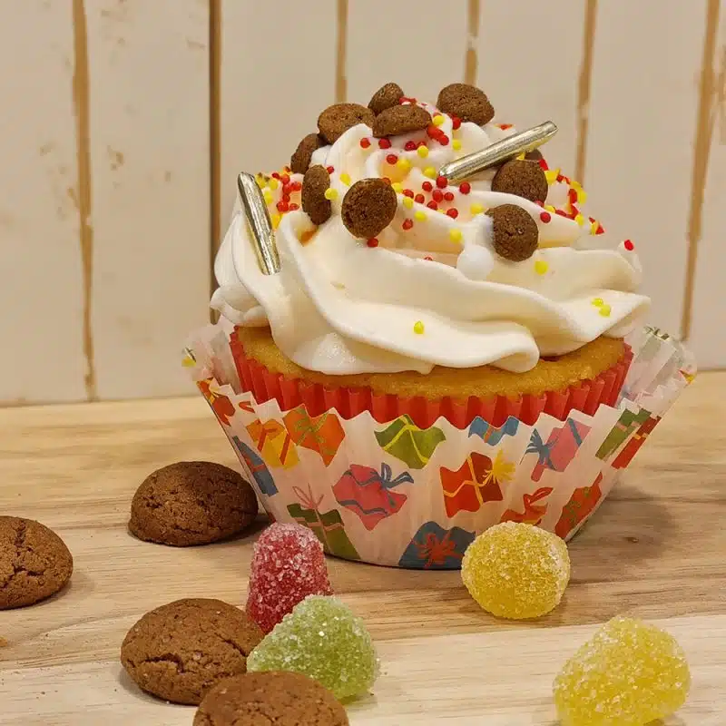 Spuit met een spuitzak met spuitmond 1M een mooie toef op de cupcakes en strooi er wat Sinterklaas Sprinkles over.